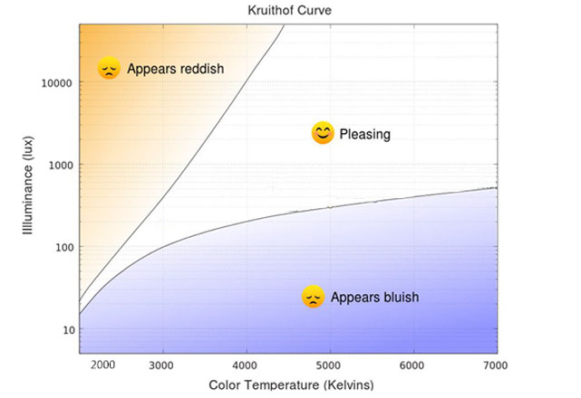 The Kruithof curve describes areas of illuminance level and color temperature that are generally considered comfortable or satisfactory to an observer. The curve was constructed from psychophysical data collected by Dutch physicist Arie Andries Kruithof, although the original experimental data did not appear on the curve. Lighting conditions within the bounded area were empirically assessed as pleasant or natural, while conditions outside the area were considered uncomfortable, unpleasant, or unnatural.