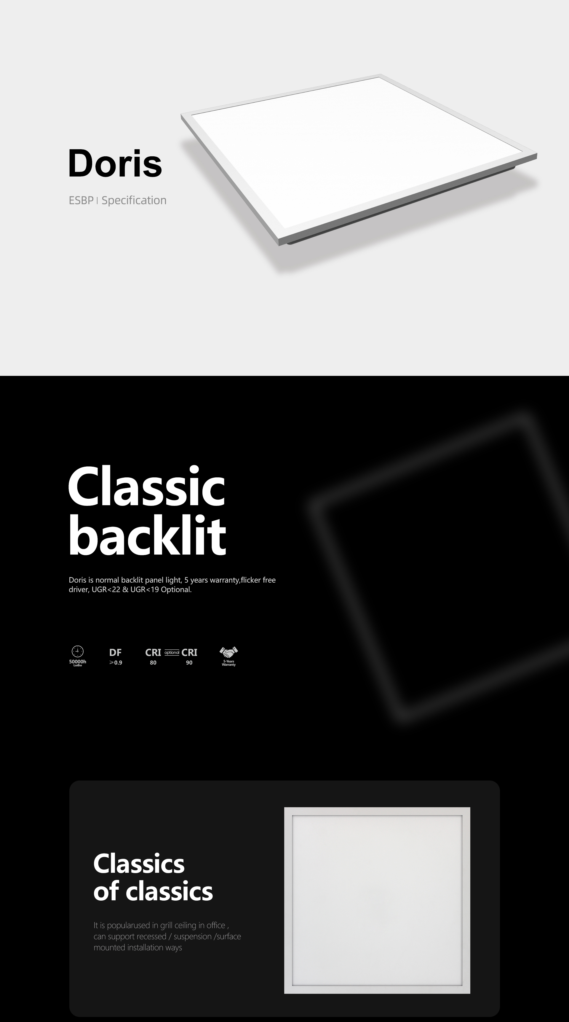 Doris is normal backlit panel light, 5 years warranty,flicker free driver, UGR<22 & UGR<19 Optional.